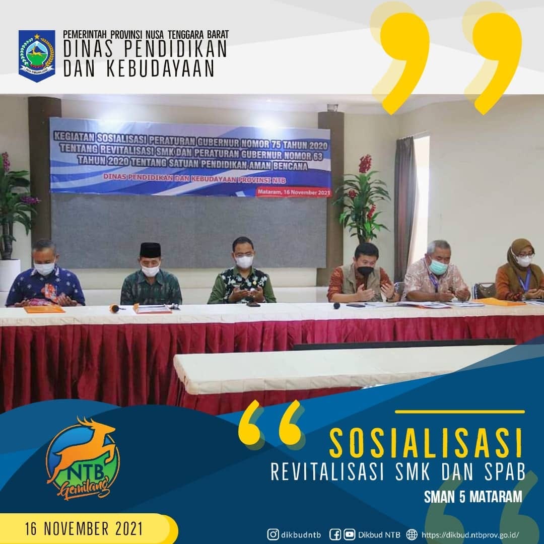 Sosialisasi yang diselenggarakan oleh Dikbud NTB pada 16 Novemver 2021, membahas Pergub No. 75 tahun 2020 tentang Revitalisasi SMK dan Pergub No. 63 tentang Satuan Pendidikan Aman Bencana. Acara ini t