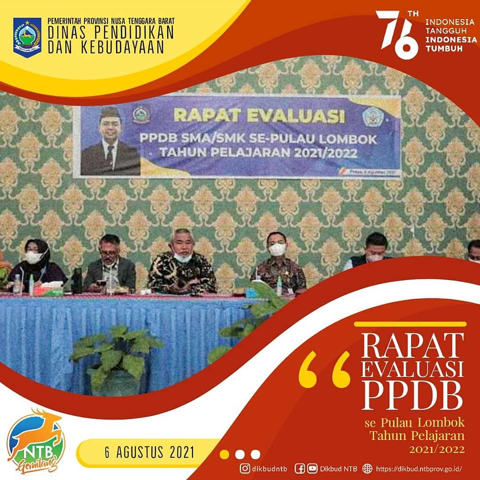 Kepala Dinas Dikbud NTB bersama jajaran kepala bidang menghadiri rapat Evaluasi PPDB 2021 di SMKN 1 Praya. Pada rapat ini juga turut serta Ombudsman, KCD dan para Kepala Sekolah secara Luring dan Dari
