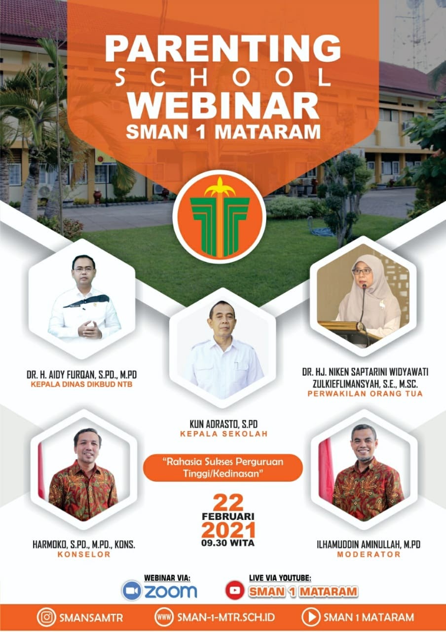 SMA Negeri 1 Mataram Senin pagi ini (22/02) Pukul 10.00 Wita - 12.00 Wita melaksanakan Parenting School Webinar yang mengusung tema "Rahasia Sukses masuk Perguruan Tinggi/ Kedinasan". Kegiatan webinar