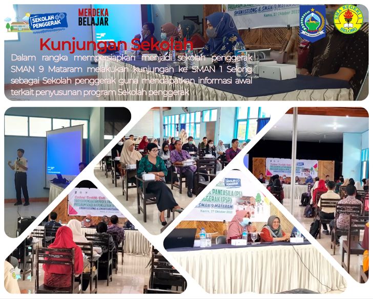 Pada hari Kamis 27 Oktoberr 2022, SMAN 1 Selong menyambut kunjungan dari SMAN 9 Mataram dalam program Berbagi praktik baik terkait program sekolah penggerak. Dalam rangka persiapan menjadi Sekolah Pe