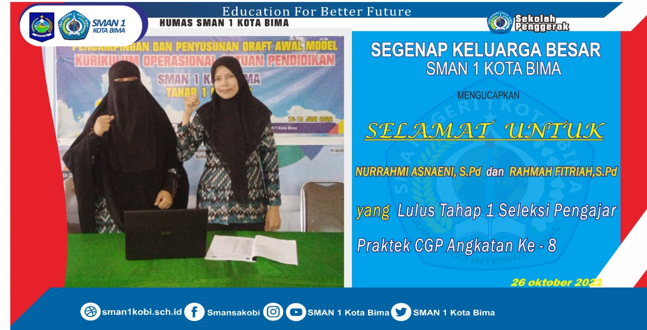Dua orang guru penggerak SMAN 1 Kota Bima Lulus seleksi tahap satu sebagai Pengajar Praktek Calon Guru Penggerak (CGP) Angkatan Ke-8. Guru tersebut yakni Rahmah Fitriah, S. Pd. dan Nurrahmi Asnaeni, S