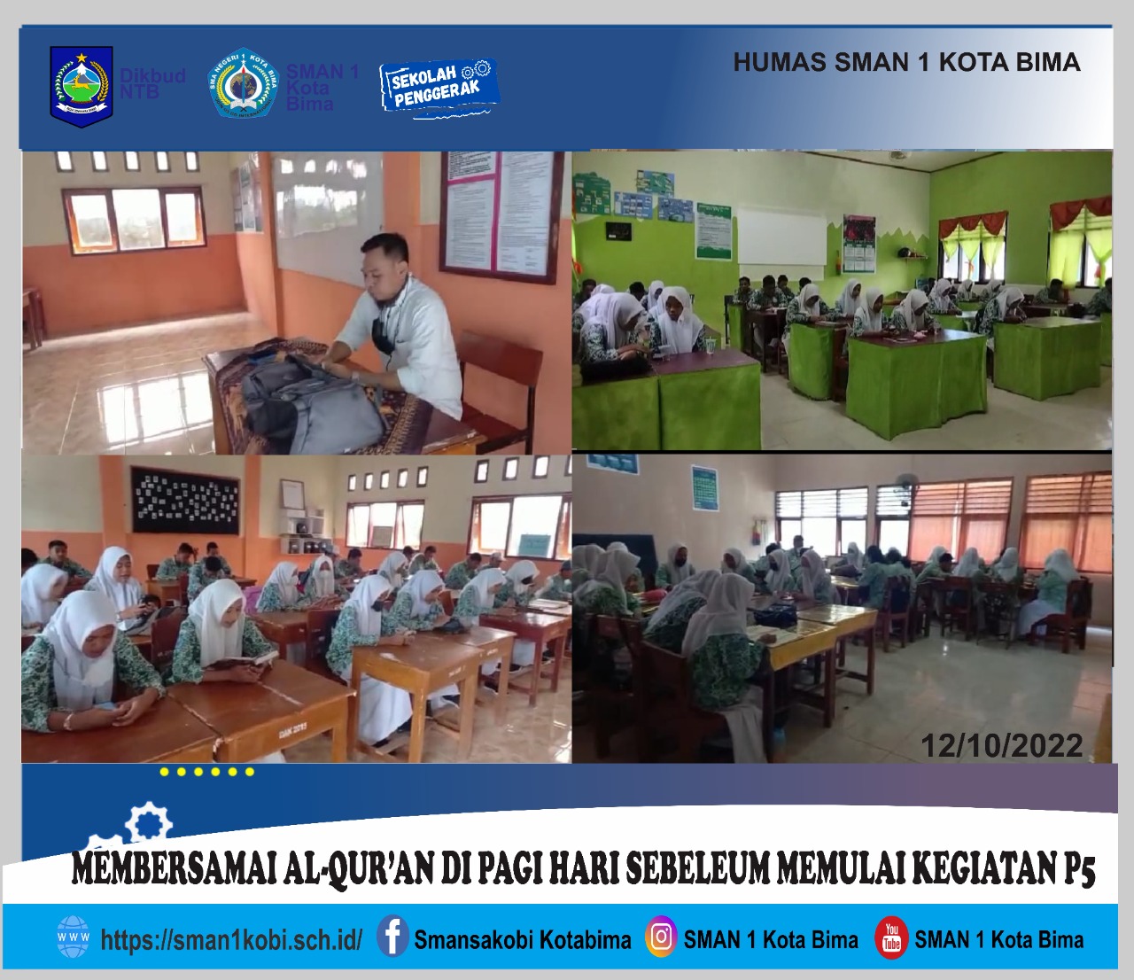 Pada hari Senin, 12 Oktober 2022 di Kota Bima – SMAN 1 KOTA BIMA Melaksanakan proses pembiasaan membaca Al-Quran pada setiap hari, di jam pelajaran pertama dengan alokasi waktu 15 menit .Pembiasaan
