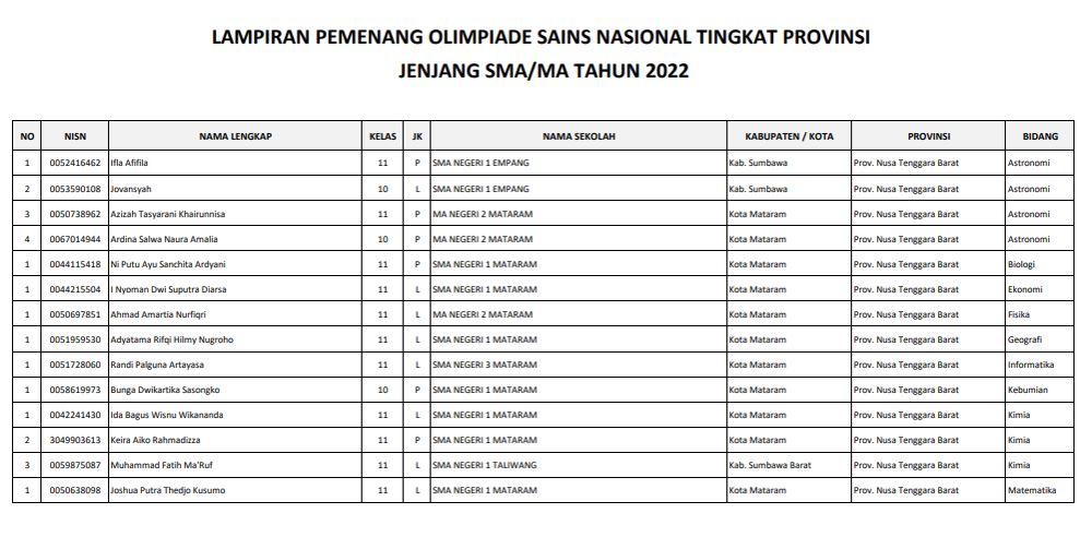 Mataram (SMANSAMTR) – Kabar gembira dan membanggakan kembali datang dari siswa-siswi SMA Negeri 1 Mataram (Smansa Mataram) yang berhasil lulus pada OSN (Olimpiade Sains Nasional) tingkat Provinsi Ta