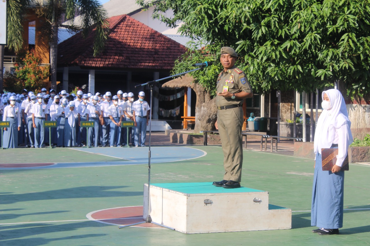 Mataram (SMANSAMTR) – SMA Negeri 1 Mataram (Smansa) pagi ini melaksanakan kegiatan rutin upacara bendera di lapangan basket Smansa dengan mengundang Kepala Satuan Polisi Pamong Praja (Satpol PP) Pro