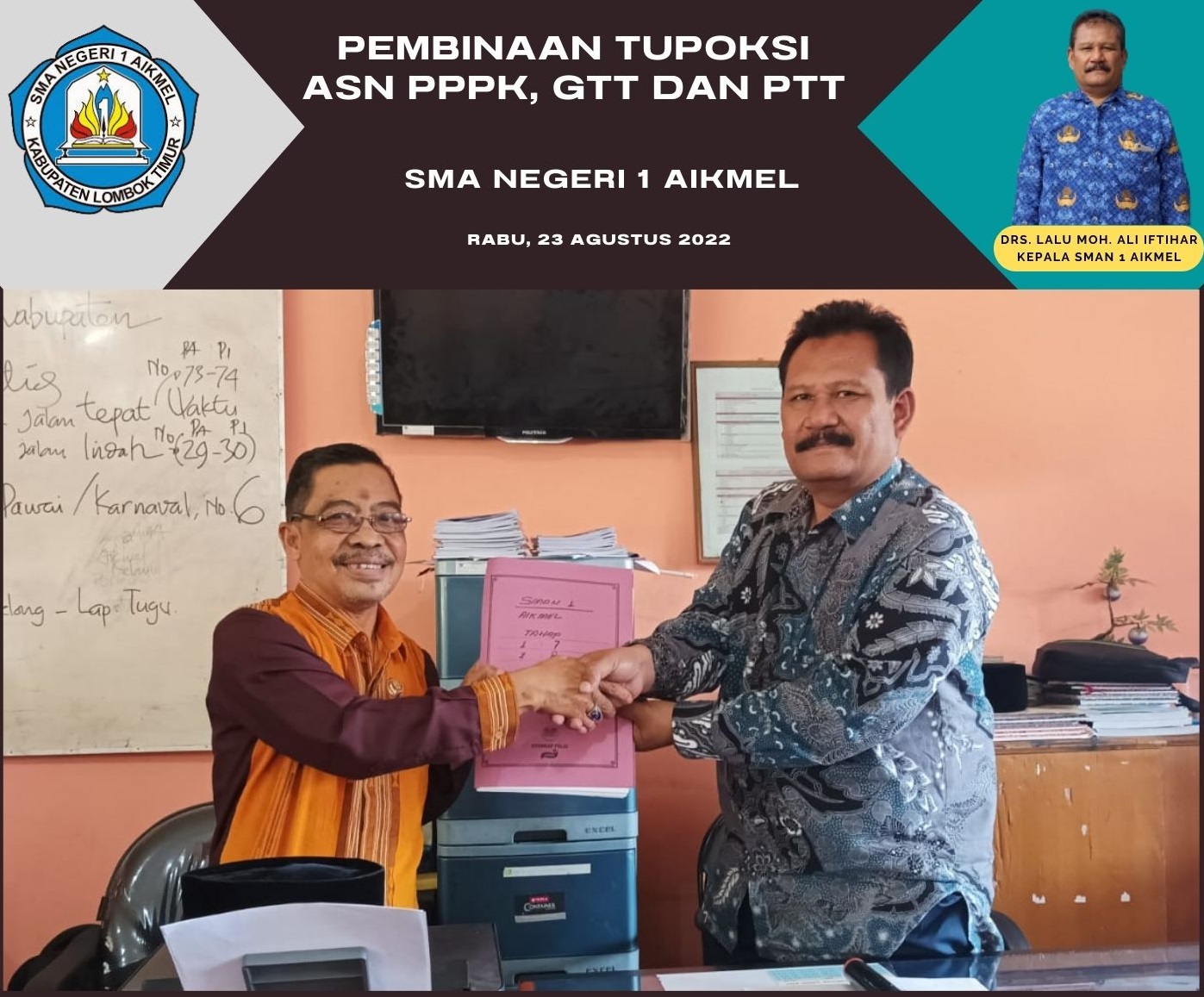 SMAN 1 AIKMEL/23 Agustus 2022. Kepala KCD cab. Lombok Timur, Bapak Dr. H. Mashun, S.Pd., M.AP. pada Selasa, 23 Agustus 2022 bertempat di SMAN 1 Aikmel kembali memberikan kuliah dua jam terkait TUPOKSI