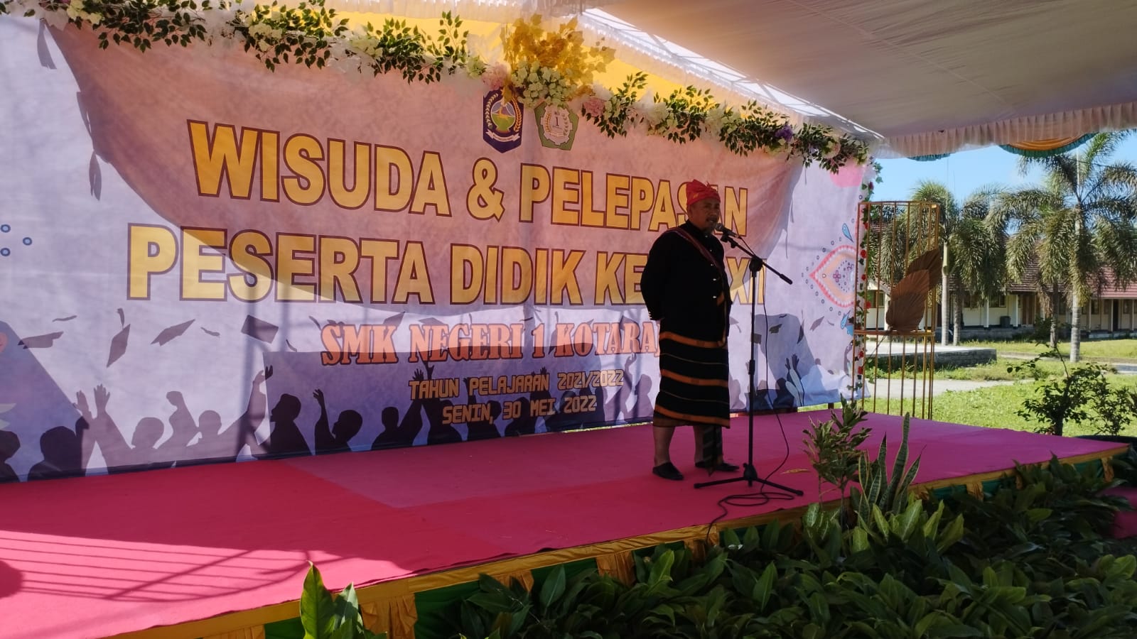 Kepala sekolah SMKN 1 Kotaraja terlihat sedang menyampaikan sambutan dalam acara wisuda dan pelepasan siswa/i tahun pelajaran 2021/2022 pada hari Senin 30 05 2022. Salman, ST., M.Pd berpesan kepada s