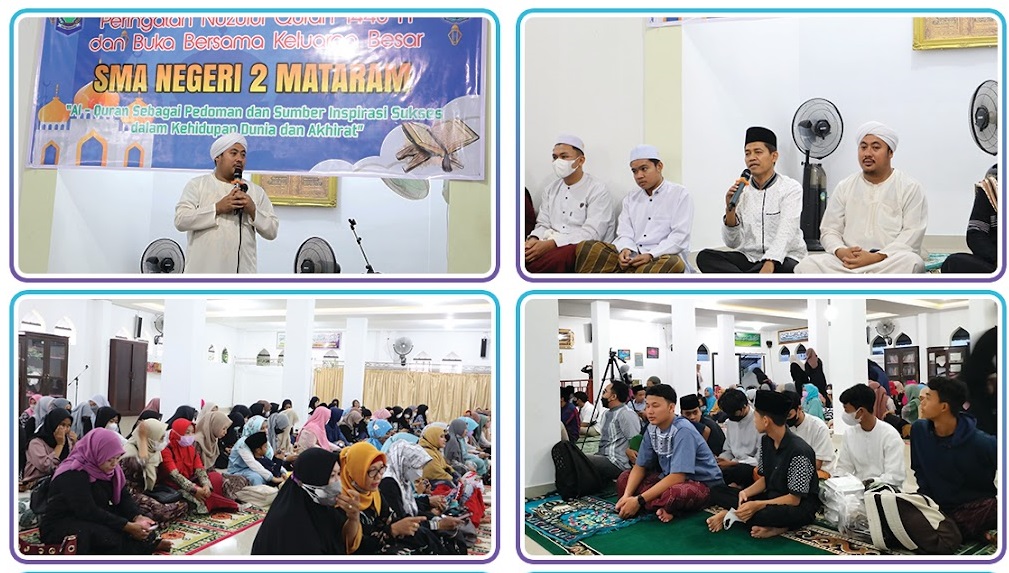 Keluarga besar SMAN 2 Mataram mengadakan kegiatan peringatan Nuzulul Qur’an dirangkai dengan buka puasa bersama yang diadakan pada hari Selasa, 19 April 2022 mulai pukul 17.00 wita. Bertempat di Mus