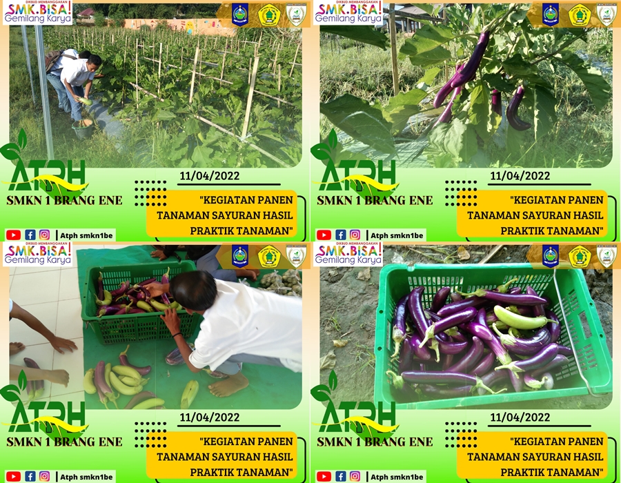Pagi hari terlihat aktivitas di lahan pertanian ATPH. Budidaya tanaman sayur (Terong Panjang dan terong lalapan). Beberapa siswa KK ATPH nampak asyik memanen tanaman sayuran. Selanjutnya tanaman sayur