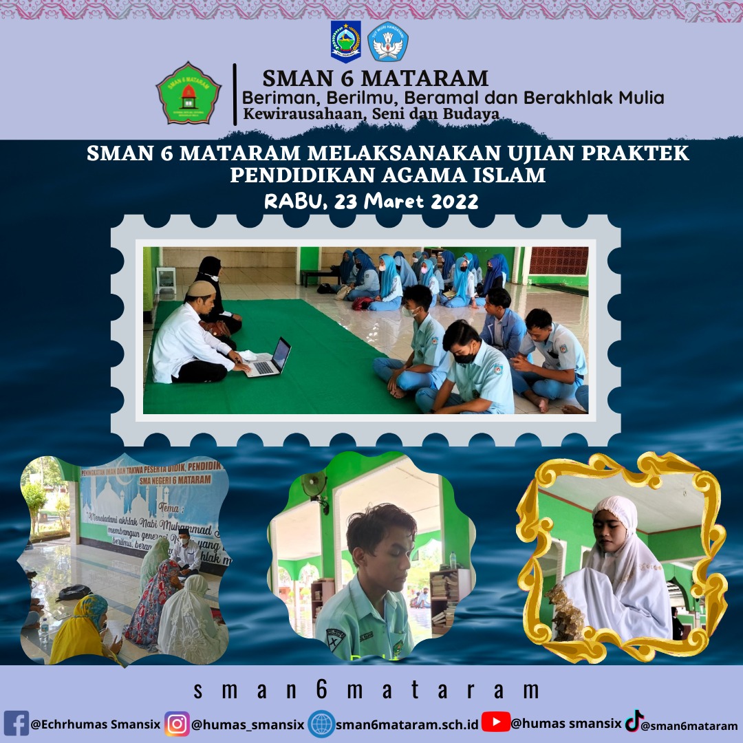 Pada hari Rabu, 23 Maret 2022- Kelas XII SMAN 6 Mataram melaksanakan ujian praktek Agama Islam. Siswa akan memperagakan tentang sholat jenazah, mengaji dan membaca Alquran. Ujian praktek merupakan sal