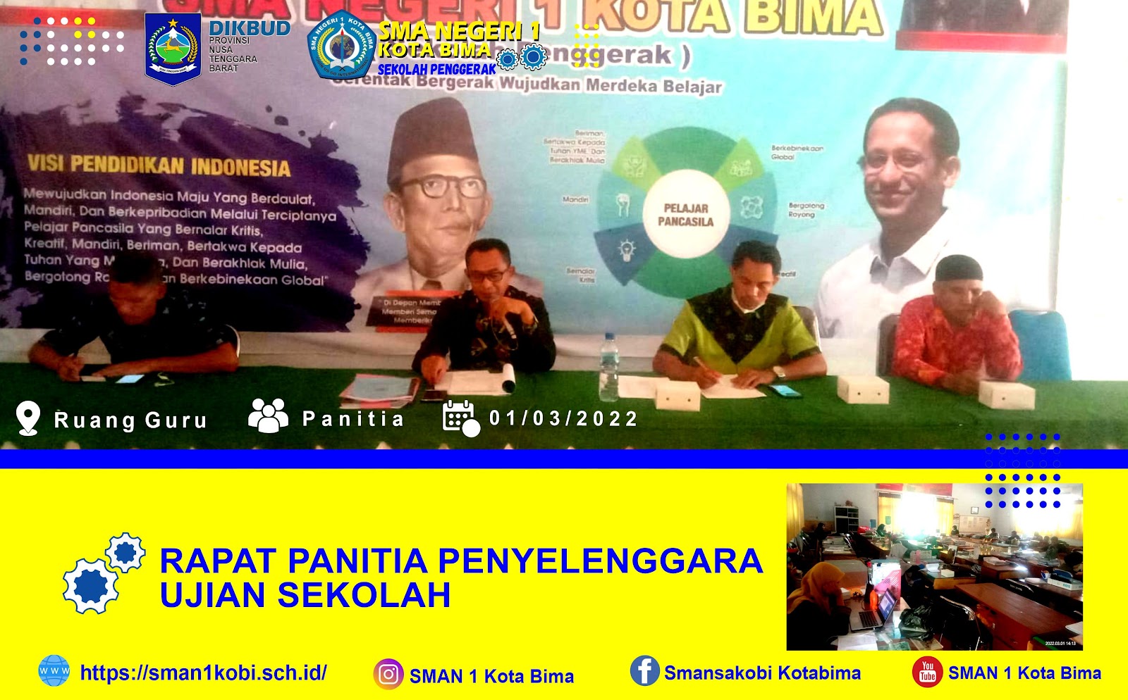 SMAN 1 KOTA BIMA mengadakan rapat penyelenggaraan ujian akhir, yang ikuti oleh seluruh panita yang terlibat. Rapat ini membahas mengenai strategi dan teknis pelaksanaan kegiatan tersebut, sehingga tid