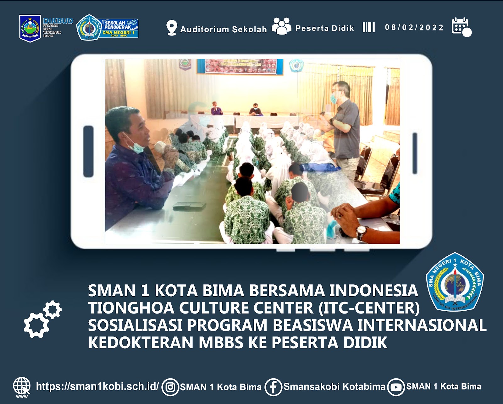 SMAN 1 KOTA BIMA bersama INDONESIA TIONGHOA CULTURE CENTER (ITC-CENTER), Sosialisasikan beasiswa kedokteran MBBS. Acara dihadir oleh puluhan peserta didik yang cukup antusias untuk mendengarkan pemapa