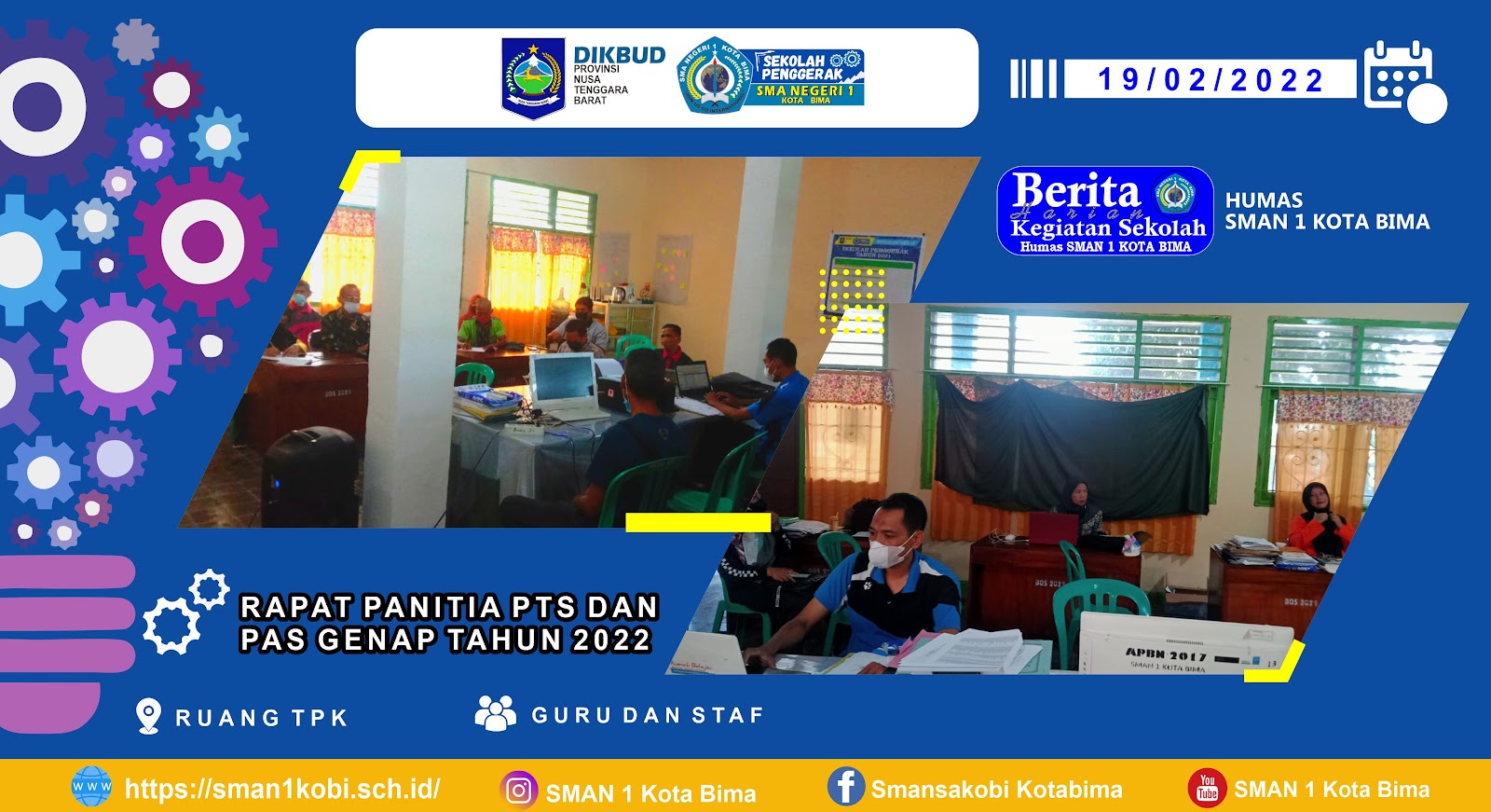 SMAN 1 KOTA BIMA mengadakan rapat persiapan PTS dan PAS genap tahun 2022. Rapat di ikuti oleh panitia kegiatan yang terdiri dari guru, staf dan kepala sekolah sebagai penanggung jawab, yang dilakukan