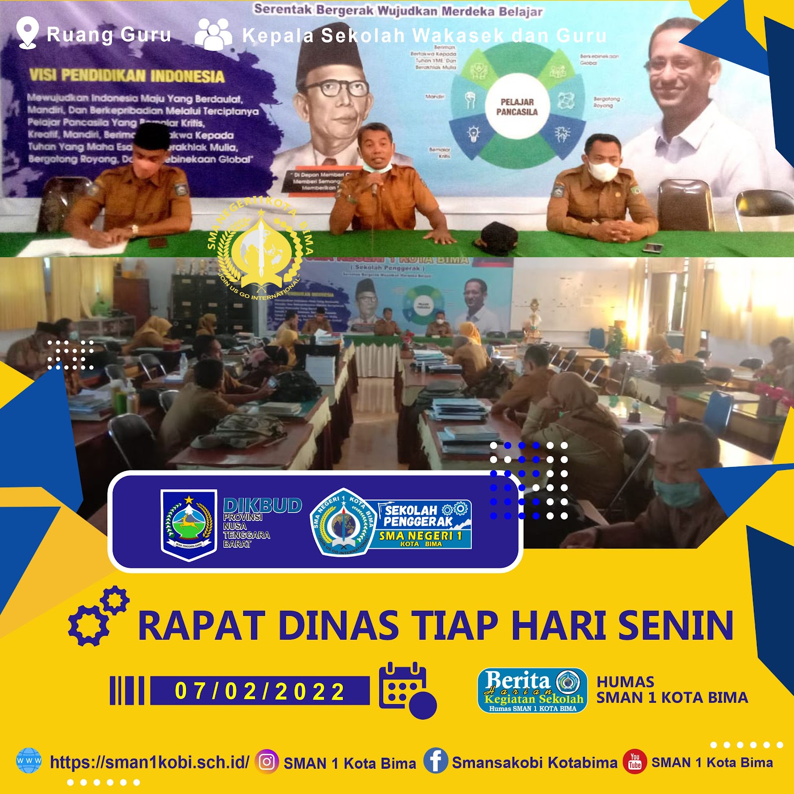 SMAN 1 KOTA BIMA mengadakan rapat dinas yang wajib di ikuti oleh seluruh stakeholder sekolah termasuk guru-guru sebagai penggerak sekolah. Rapat wajib ini merupakan budaya SMAN 1 KOTA BIMA yang bertuj