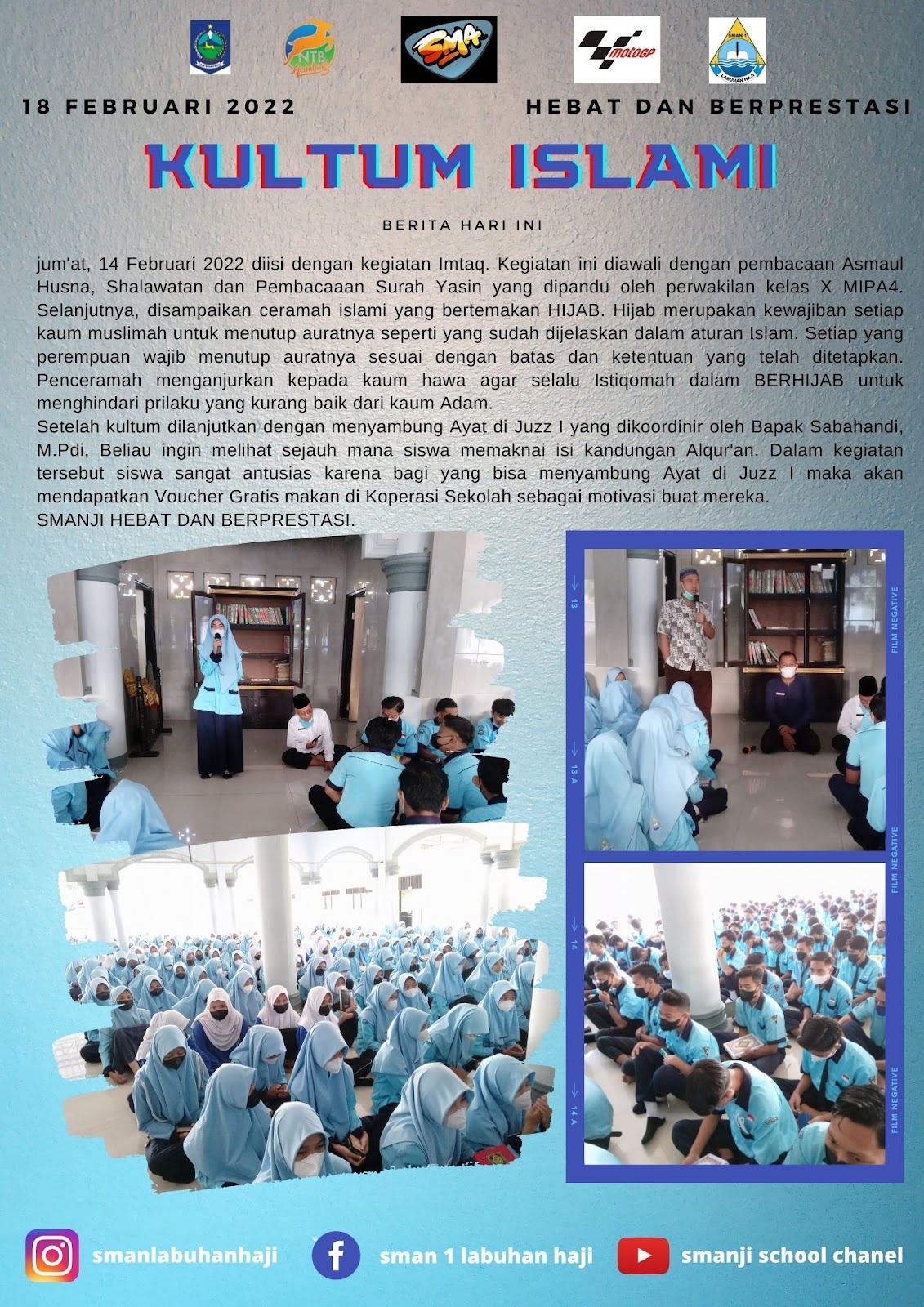 Jum'at, 14 Februari 2022 diisi dengan kegiatan Imtaq. Kegiatan ini diawali dengan pembacaan Asmaul Husna, Shalawatan dan Pembacaaan Surah Yasin yang dipandu oleh perwakilan kelas X MIPA4. Selanjutnya,
